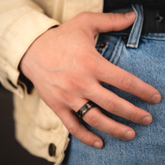 For far too long, wedding rings have been simple, uninspired bands of metal, lacking the personality and character of the wearer. But times are changing. More and more people are stepping away from traditional silver or gold bands, seeking rings that truly reflect their individuality and passion. Inspired by the raw, volcanic beauty of obsidian stone, this black hammered tungsten ring captures that same primal intensity and refined strength.