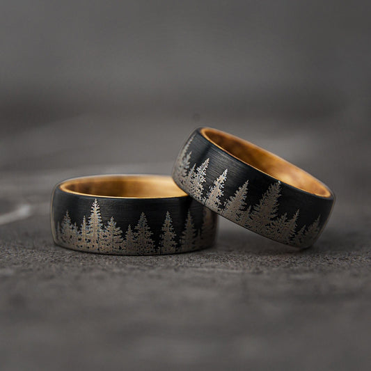 HIDDEN FOREST SET - Whiskey Barrel Wood Tungsten Couple Rings