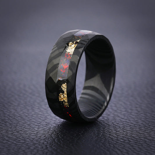 CRIMSON PROMISE - Luxury Damascus Steel Menโs Ring with Red Opal & Gold Flake Inlay